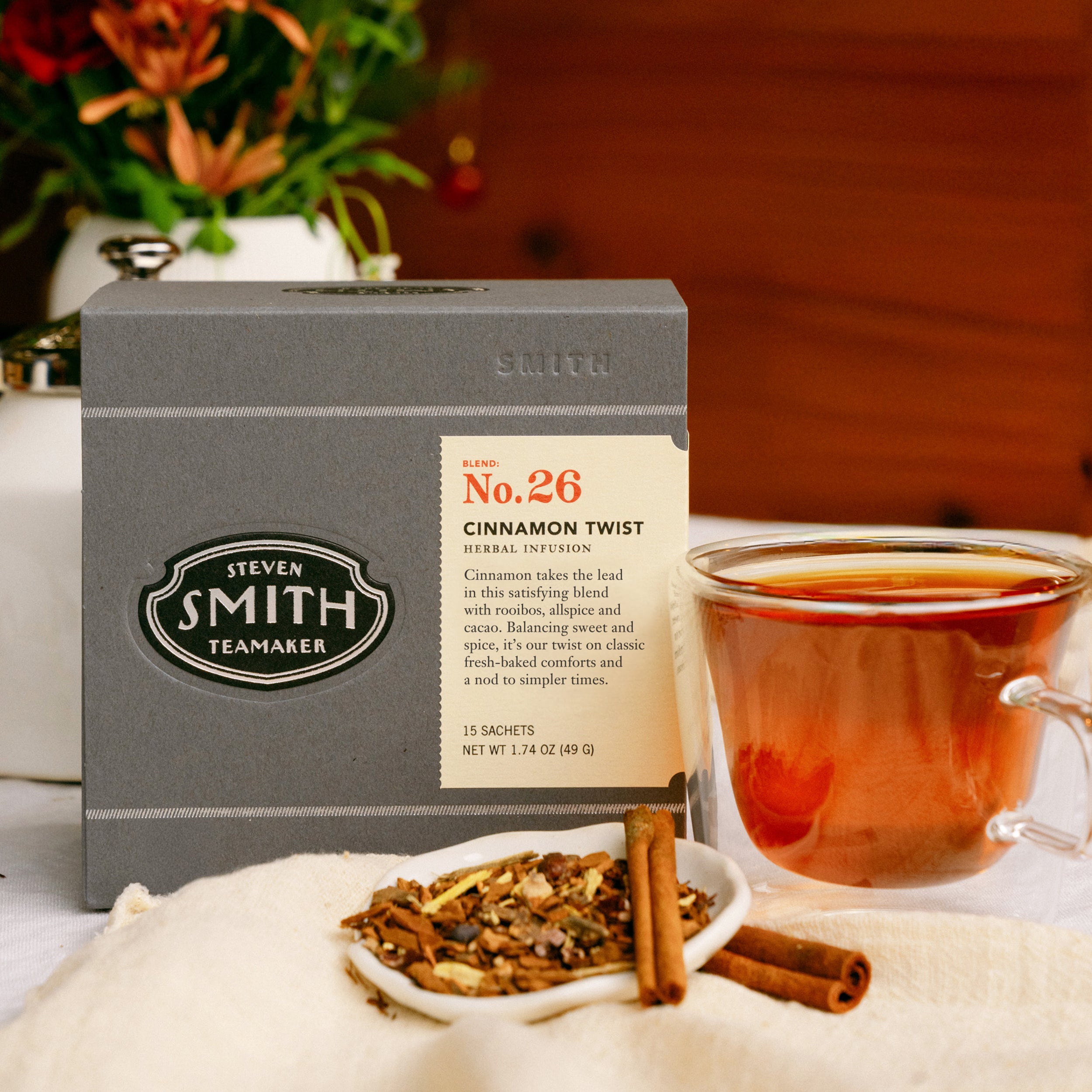 Cinnamon takes the lead in this satisfying blend with rooibos, allspice and cacao. Balancing sweet and spice, it's our twist on classic fresh-baked comforts and a nod to simpler times.